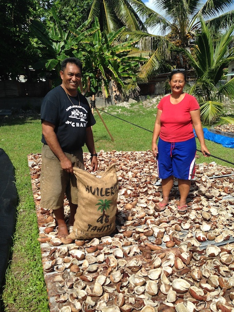 | The pieces of coconut meat are called copra. The copra is spread out on corrugated metal to dry in the sun for another 3 days. A nearby tarp is used to cover the copra in case of rain. The dried copra is put into 25 kilo sacks. Each sack is currently worth about $35. The sacks are shipped to Tahiti where coconut oil is pressed. |